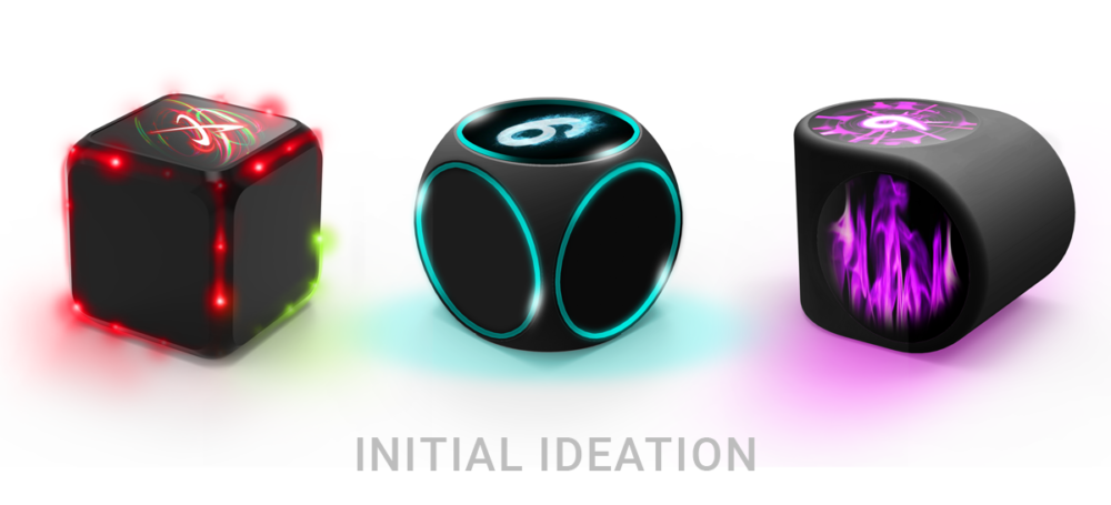 We began by looking at the core focus; how we could integrate the digital aspect to a die, whilst keeping similar properties to a polyhedral set. The initial exploration looked at technology, expected weights, sizing, and from that looking at 3D forms to suit. A key part of the ideation phase was looking at how to integrate light to create an immersive experience.